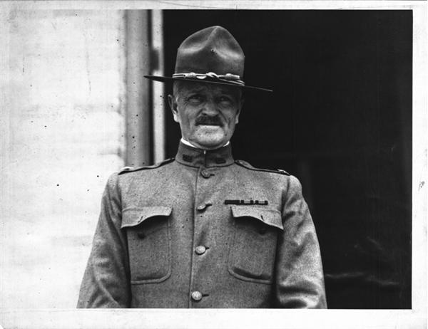 General John J. Pershing as he is about to leave for Mexico to take on Mexican Revolutionary Pancho Villa. Original paper action on verso of this vintage International News Service wire photo. 6.5 x8.5”, NRMT.