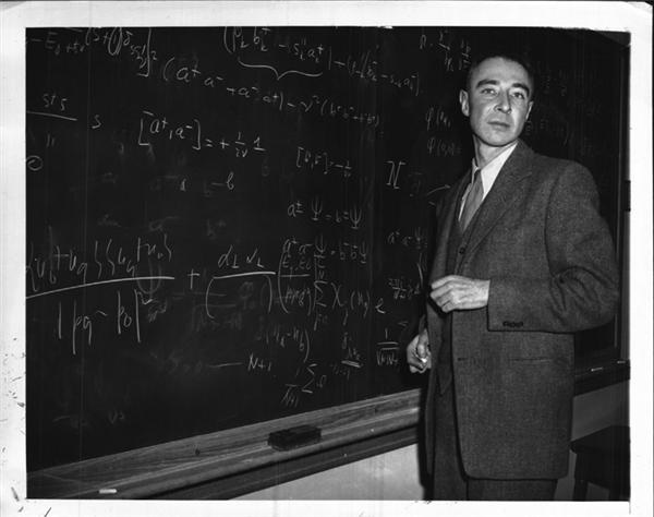 Stunning image of the Father of the A-Bomb at the blackboard with mathematical equations. Original paper caption. 7 x9”, NRMT.