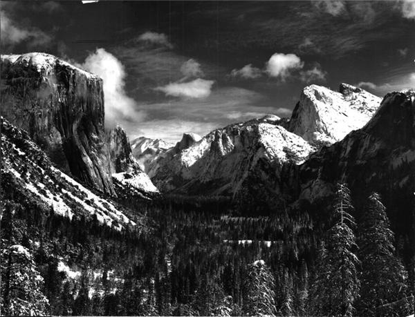 1949 Spectacular view of the snow covered Yosemite landscape gives us the feel of a winter based sculpture. Elaborate stamp on verso, “Photograph by Ansel Adams from ‘My Camera in Yosemite Valley’ Published by Virginia Adams, Yosemite, and Houghton Mifflin Company, Boston” with copyright release.