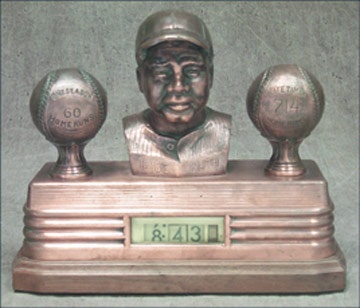 The finest example of this highly prized piece we have seen. Issued in the months following the Babe's death, this clock commemorates the biggest Yankee of all with a fine brass bust at center and flanking baseballs noting both his single-season and career home run records. Electric clock is below. Wood base. Tarnishing and very minor paint loss on gold trim are the only defects. Simply magnificent.