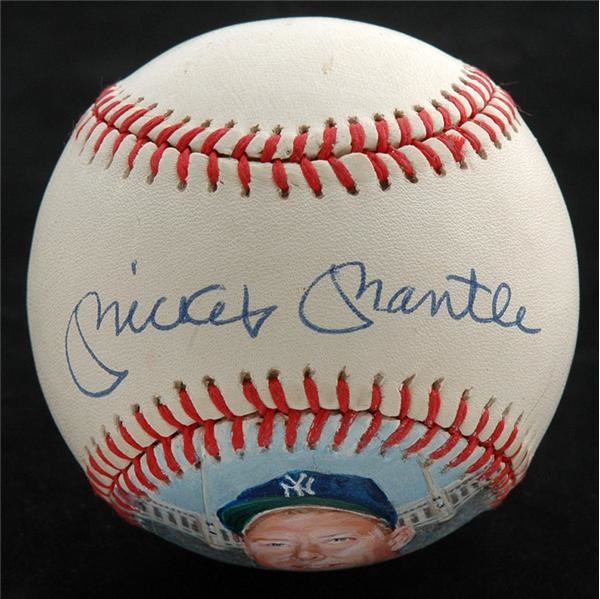 Official American League (Brown) baseball signed in blue ballpoint pen on the sweet spot. Beautiful portrait of Mantle is painted on the panel below the signature. Masterpiece was done by noted sports artist, Jolene Jessie.