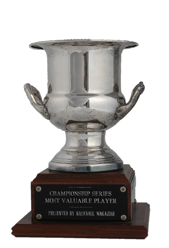 Silver cup trophy sits atop a wood base with engraved plate on front which reads “Championship Series Most Valuable Player Presented by Baseball Magazine.” Plates on left and right side have engraved recipients - “National League: 1977-Dusty Baker L.A., 1978-Steve Garvey L.A., 1979-Willie Stargell PIT, 1980-Manny Trillo PHI” and “American League: 1980-Frank White K.C.” Measures 14 ?” high and 10” wide. Included with the award is an interesting grouping of material from the files of Baseball Quarterly Magazine. In the years 1978, 1979 and 1980 Baseball Quarterly Magazine sent out questionnaires to all of the managers in major league baseball asking them to pick the performer of the year. The managers filled in their top five picks and most (but not all) signed on the line marked "signature." Managers who signed include Sparky Anderson, Bobby Cox, Earl Weaver, Whitey Herzog, Don Zimmer, Dick Williams, Tommy Lasorda, Joe Torre, Dick Howser, and more. There are 55 total pieces with about 2/3 of them being signed. Condition is EX-MT with bold signatures.