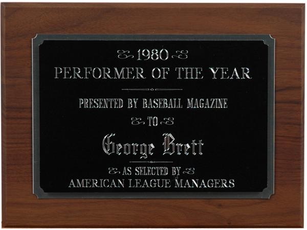 9 x 12'' wood backing with metal plaque affixed that reads "1980 Performer of the Year Presented by Baseball Magazine to George Brett as Selected by American League Managers." This is the Baseball Magazine office copy. Condition: Mint.
