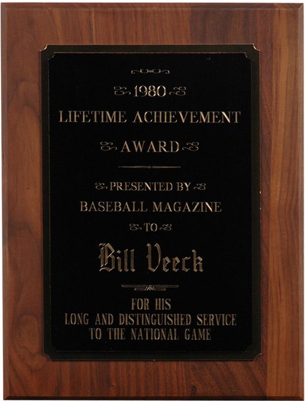 9 x 12'' wood backing with metal plaque affixed that reads "1980 Lifetime Achievement Award Presented by Baseball Magazine to Bill Veeck For His Long and Distinguished Service to the National Game." Also includes the original Baseball Magazine press release and a photo of Veeck receiving the award. This is the Baseball Magazine office copy.