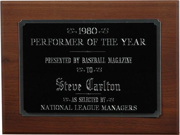 9 x 12'' wood backing with metal plaque affixed that reads "1980 Performer of the Year Presented by Baseball Magazine to Steve Carlton as Selected by National League Managers." Also includes the original Baseball Magazine press release. This is the Baseball Magazine office copy. Condition: Mint.