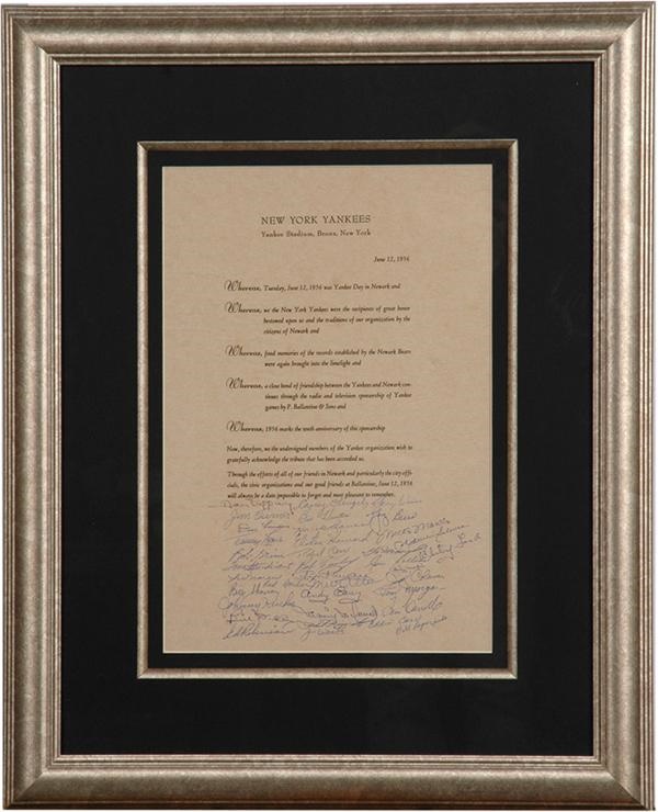 Proclimation signed on June 12, 1956, "Yankee Day" in Newark NJ. This impressive piece is signed at the bottom by 37 members of the 1956 Yankee World Championship team including Mickey Mantle, Billy Martin, Casey Stengel, Dan Topping, George Weiss, Elston Howard, Yogi Berra, Whitey Ford, Bill Dickey, Mel Allen and more. 12 x 17'', framed to 22 x 27.5''. All of the signatures are in mint blue ballpoint, except for Dan Topping who has signed in fading black ink. Near Mint.