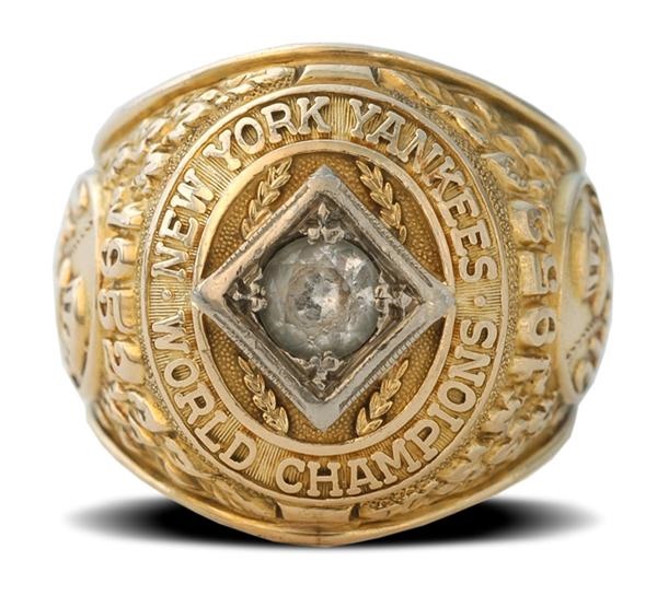 Celebrating the 4th in the Yankees’ 5 consecutive World Series titles (’49-’53), this 14K gold ring has a “Robert L. Kuzasla” engraved in shank, along with “Balfour 14K.” Encircling cubic zirconia centerpiece is “New York Yankees World Champions” in raised letters. Each side has championship year “1952” above top hat logo with “Yankees” in script. Size 10.5