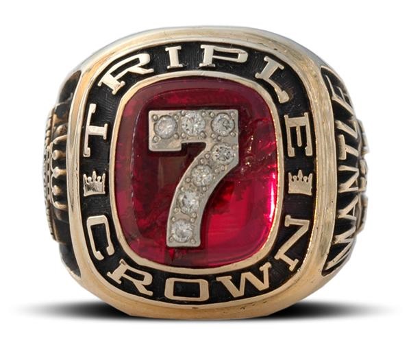 10K gold ring heralds Mantle’s 1953 standout Triple Crown performance - the first we have handled! Precipice adorned with seven diamonds inside his #7 embedded atop ruby pool and surrounded by lettering “Triple Crown.” One shank illustrates a baseball diamond (over criss-crossed bats) with “1956” at home plate, his “130” RBI’s at first base, the “52” home runs at second, and batting avg. “.353” at third - all below name “Mantle.” The other side highlights winners (from top to bottom) “Yastrzemski, Robinson, Williams, Mantle,” below “Triple Crown.” Has manufacturer marks in ring. Size 12.5.