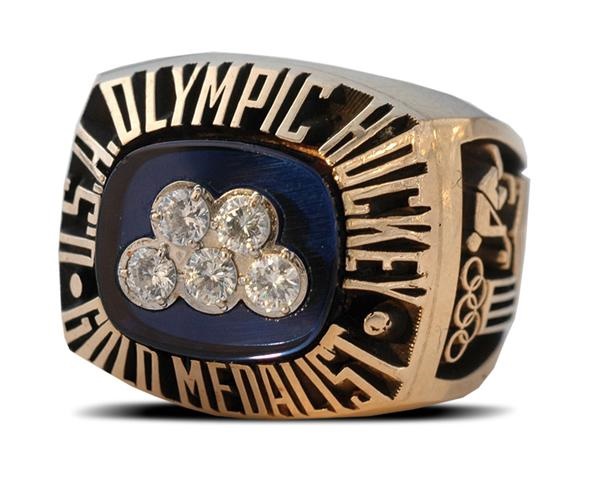 Miraculous memories reflect off of this 10K Olympic Gold Medal sample ring, as original was presented to goaltender Jim Craig for his stellar performance en route to the U.S. ice hockey team’s winning gold at the 1980 Lake Placid Winter Games. Five jewels upon a blue plane glitter at its center, surrounded by “U.S.A. Olympic Hockey Gold Medalist” in raised block lettering. On one side, below Olympic logo, is “USA4USSR3” in slightly larger lettering than the “USA4FIN2” below it (a reflection of the importance of the semi-final over the final), while “1980” bolds even bigger below that. The other side is “Craig” and his # “30” raised and bold. Inside band is engraved scripted “Miracle on Ice” as well as team’s competitive journey to semis: “USA2 SWEDEN2, USA7 CZECH3, USA5 NORWAY1, USA 7 ROMANIA2, USA 4 W GER2.” Size 10.5 Balfour 10K
