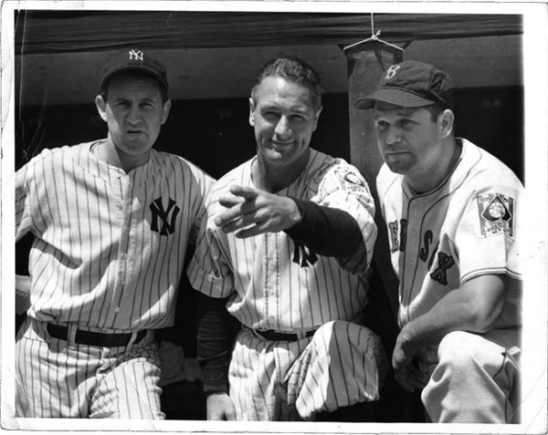 Playful image has Gehrig pointing, Foxx looking, and Gomez staring down the photographer. Dated circa 1930’s. 7x9”, EX-MT.