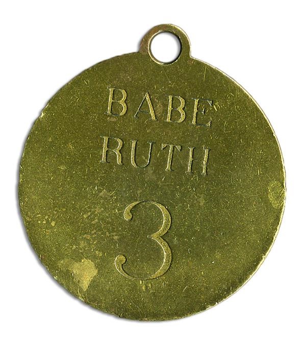 Ruth was a Yankee from 1920-34, and here is an intimate item from that tenure, the Babe’s brass locker tag (2"), with engraved “Yankee Stadium, The Bronx, New York, Locker 3” and on reverse, “Babe Ruth 3.”