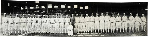 4.5'' x 19'' panoramic photograph of the 1929 American League Championship team made out of two vintage wire photos. Pictured are Jimmie Foxx, Connie Mack, Al Simmons, Mickey Cochrane, Lefty Grove, Eddie Collins and more. This was one of the best teams in baseball history. Overall Excellent.