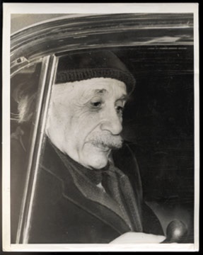 The brilliant Nobel physicist leaves a New York City hospital after undergoing abdominal surgery. Wonderful image of the century's greatest scientific mind is EX with attached paper caption.