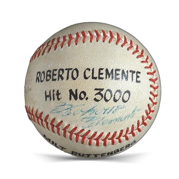Historic sphere is the actual first pitch ball from the game at Three Rivers Stadium on September 30, 1972. Some may have suspected that this day would yield Roberto Clemente's 3,000th career hit but no one was aware that this would be the day when number 3,000 would be the last of the legendary Clemente's regular season career. Official National League (Feeney) ball displays even use but remains in EX condition. On one panel in black paint is "ROBERTO CELEMTE Hit No. 3000". Underneath, Clemete has signed in 7/10 blue ballpoint pen. On another panel in black paint is "MILT RUTTENBERG NR Day at Three Rivers Satdium, Sept. 30, 1972". Mr. Rutttenberg was an executive with the company that sponsored the game and he had the honor of throwing out the first pitch. When the game was over this ball was immediatley lettered and signed by Clemente. It was then presented to Mr. Ruttenberg. There are two photos (framed) of Ruttenberg throwing the ball with his name on the scoreboard. Also, an original ticket from the game is matted between the two photos. LOA.