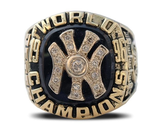 Great replica ring acknowledges Derek Jeter’s first World Series win with the Yankees in 1996, immortalized by his first post-season home run, thanks in kind to that 12-year-old kid in the stands. Diamonded “NY” centers at top on blue island, with “1996 World Champions” circling. Right shank has “Tradition” design, while left shank has “Jeter” atop “Courage” and “Heart” scroll design over WS trophy. Ring size is 10.