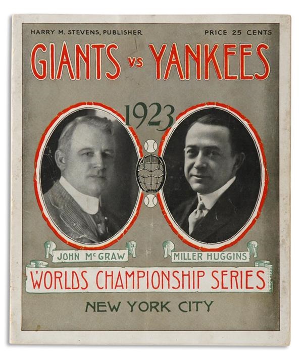 A superb program for the 1923 New York World Series shows photos of Giants and Yankees managers John McGraw and Miller Huggins, respectively, on cover, and a fantastic photo page for each team’s roster, including Casey Stengel, Frankie Frisch, and Babe Ruth. EX condition, with some creasing and spotting on cover, as well as some wear and minor tears on back cover.