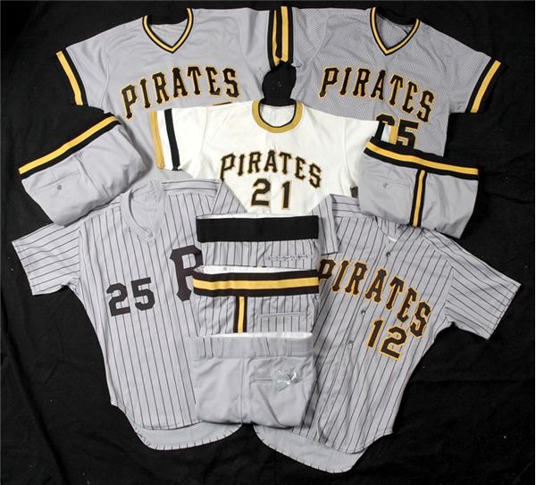 Includes early Roberto Clemente sample, Rawlings size 42 label on the tail. Rawlings size 42 for #12 with 1986 year tag, and three different styles made by Decente with either #25 and #85. Total of five jerseys and five pair of pants.