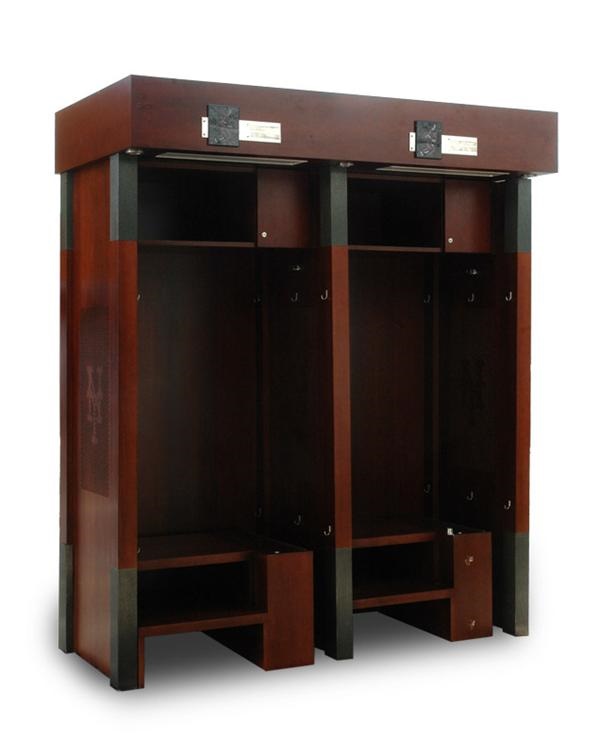 Out with the old, in with the new - new lockers, that is, for Citi Field and the Mets, and particularly for third baseman David Wright and shortstop Jose Reyes, as these two prototype lockers (inseparable, and considered one piece) were modeled for these two New York stars. Double-locker stands 7ft. 6 in., 31 inches deep, and 6 ft. 3 in. wide, and is an all wood structure that comes with both an open space and locked cabinet above, a large sit ‘n’ step seating structure with lock cabinet below, as well as nine hang hooks and one hanging cross pole. Above locker space is name plate and lighting fixture. Stylish wood ventilation designs on each side of locker have Mets’ “NY” insignia.