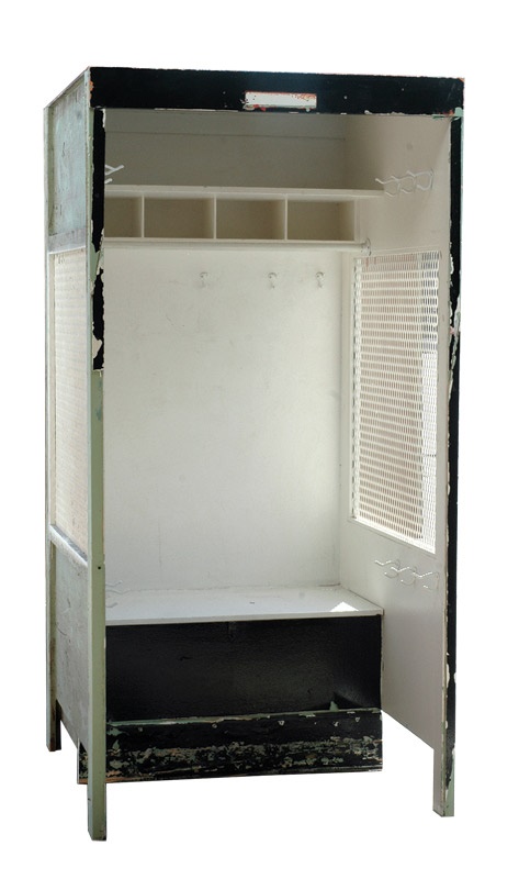 Nolan Ryan’s relief skills were critical to the Amazin’ New York Mets’ World Series title in ’69 - a standout performance when you consider that two years previous he was sent back to the minors for some fine-tuning. The Mets were Ryan’s first team, and surprisingly, given his record 27 seasons in MLB, the only team he pitched for in a World Series. So there is a fondness for Ryan as a Met, and here is offered the Hall of Famer’s well-used locker from Shea Stadium. An all-wood structure, measuring 43”x43”x 7ft. tall, painted white on the inside and crudely green on the outside. Inside there are 12 plastic hooks, an iron cross pole, four small compartments under a wider space on top, and a bench whose seat is a clasped cover for the storage space underneath. Side walls have large metal mesh ventilation section. Front has black trim with lots of chipped paint from use and age, and a space where nameplate used to be.
