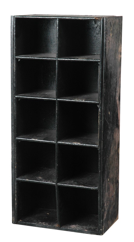 Helmet rack from the Shea Stadium visitors dugout provides 10 sections for storing head gear, each measuring 9” x 9”. Constructed of black painted plywood including dividers. Entire case is 24” tall, 52” wide and 13” deep and bears numerous dents, scratches, etc.
