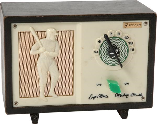 Charming piece recalls that delirious 1961 season when Mantle and Maris chased Ruth. This 1962 radio has the original knobs, is wood and plastic, and contains the two competitive sluggers’ names at its bottom. EX-MT.