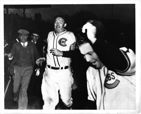 Famous photo of Gabby Hartnett after hitting his famous “Homer in the Gloamin” to put the Cubs into 1st place and helping them to clinch the National League Pennant a few days later. Stamped on the back by the photographer Henry Schaefer. 7 x 9’’. Excellent.
