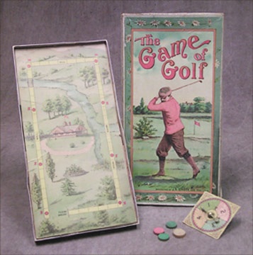 One of the finer golf games that exists. Box top sports wonderful image of swinging linkster. Playing surface is bright and beautiful, with marvelous image of an early course. Original playing pieces are here as well as spinner with wood arrow. By J.H. Singer of New York, one of the finest games makers of all.