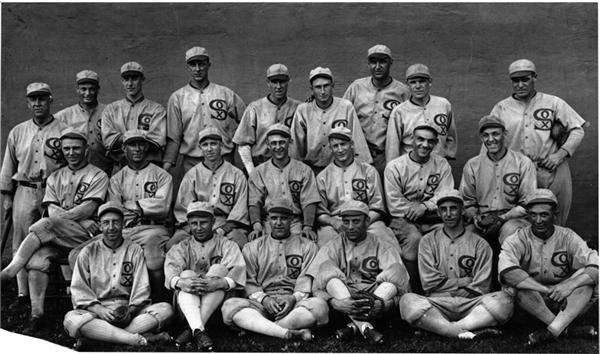 The team that threw the World Series. The team, including all eight men out as well as Eddie Collins and Ray Schalk, pose candidly for the camera. Crystal clear image. International news stamping on the verso. About 5.5 x 9''. Overall Excellent.