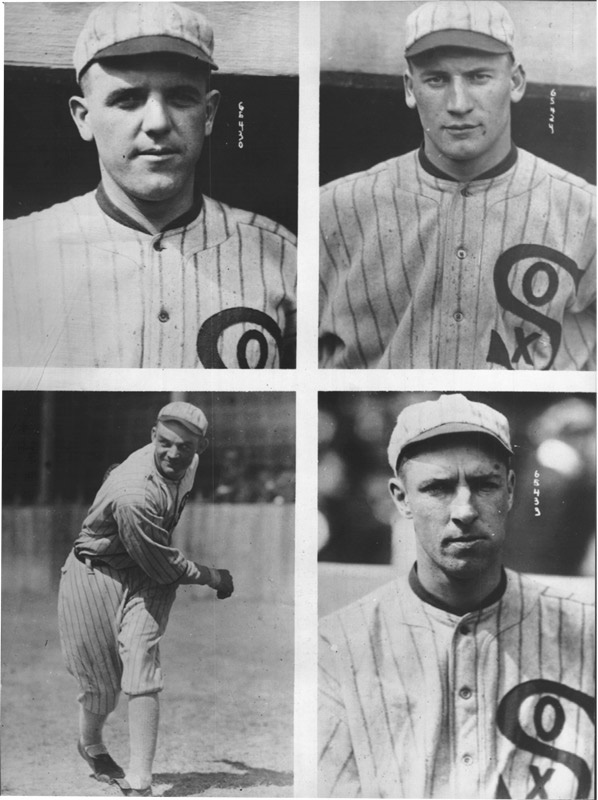 The Eight Men Out are pictured on these two vintage news service photographs dated Oct 1, 1920 on the verso. Pictured are Joe Jackson, Ed Cicotte, Buck Weaver, Fred McMullin, Swede Risberg, Lefty Williams, Hap Felsch, and Chick Gandil. Original caption sheets included. About 7 x 9''. Excellent.