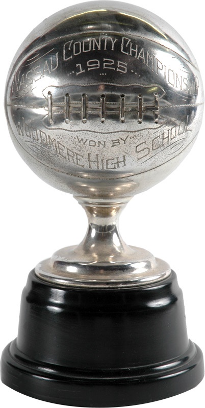 This terrific silver trophy has etched in its basketball-styled top figure, “Nassau County Championship, 1925 won by Woodmere High School.” Roster and coach are etched on its back. It stands almost 13 inches tall, and has on its wood base a metal tag with “Made by Dieges & Clust.”