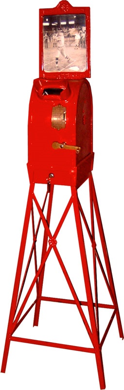 Rare coin operated machine with an even rarer Mutoscope reel featuring Babe Ruth. Many repros have come on the market but this is a real one. This particular reel, circa mid-1920's, not only depicts "The Bambino" sparring with Artie McGowan who trained Jack Dempsey, it also shows Ruth at Yankee Stadium taking some practice swings. Great stuff!! The machine has been beautifully restored by one of the top coin op restorers in the nation. It is also in its excellent working condition. The fitting photo on the header is a perfect copy of Ruth in one of his Hollywood exploits. The stand is a repro which perfectly mimics the long gone original. Manufactured by the International Mutoscope Reel Co., New York, New York. A centerpiece for any sports game room or serious collector of baseball memorabilia. Stands nearly as tall as you.