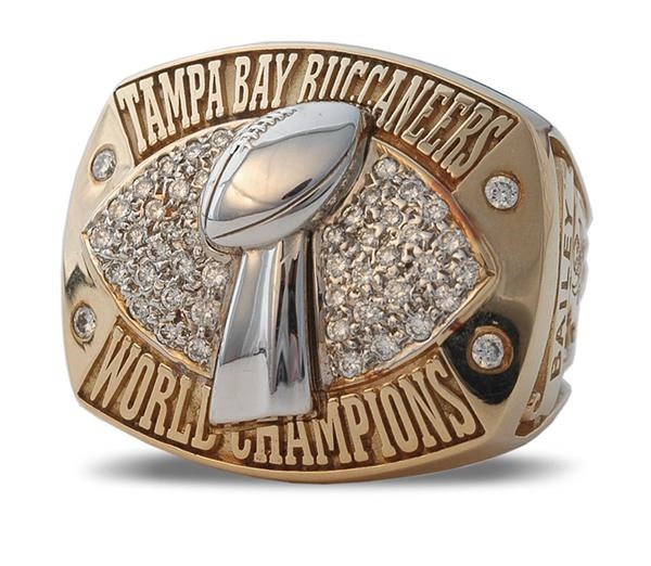 14K Gold Ring with real diamonds made by Tiffany & Co. Raised Superbowl Trophy on the top surrounded by numerous small diamonds. "Tampa Bay Buccaneers" in raised letters above the trophy and "World Champions" below. The name "Bailey" is engraved on one side and Superbowl XXXVII logo on the other. Stamped "Tiffany & Co 585" inside of the shank and engraved "Charlie S Bailey" inside. This is a "B" version of the ring. Size 11. Mint.