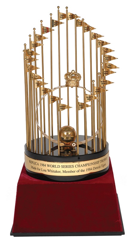 Tough to compare a team to the ’27 Yankees and its “Murderer’s Row,” but the 1984 Detroit Tigers were the first club to lead their division from opening day to the World Series title since that stellar New York team pedestalled their season. This is second baseman Lou Whitaker’s personal October Classic crown -- a rare and glittering find, as it is the first full size tiger trophy on market and directly from a players collection with his LOA. It stands 24 ?” (32” with original maroon velvet travel base on which it rests). Engraved gold band on black base reads “Replica 1984 World Series Championship Trophy - Made for Lou Whitaker, Member of the 1984 Detroit Tigers,” with “Copyright 1983 Commissioner of Baseball” on back of band. Balfour sticker on bottom. Includes LOA.