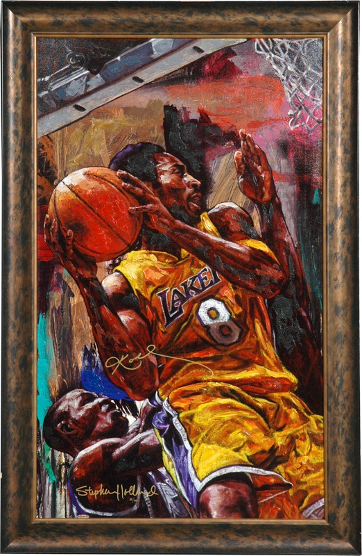 Laker guard Kobe Bryant rises above the defense, as artist Stephen Holland catches a glimpse of the backboard in this dynamic portrait. Giclee on canvas measures 29x46” in beautiful concave-styled frame, and is signed by Holland, and Bryant in gold pen.