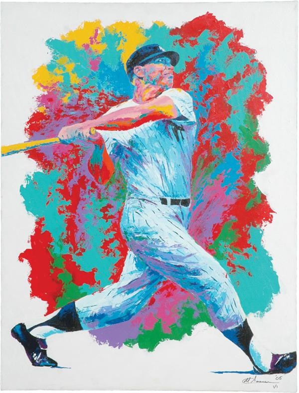 Mantle explodes from the hips in this Neiman-styled acrylic on canvas - the Yankee’s talent to hit the long ball is celebrated in artist Al Sorenson’s depiction of the slugger looking skyward and bursting from color. This unframed original (1/1) is signed and dated (’05) by Sorenson.