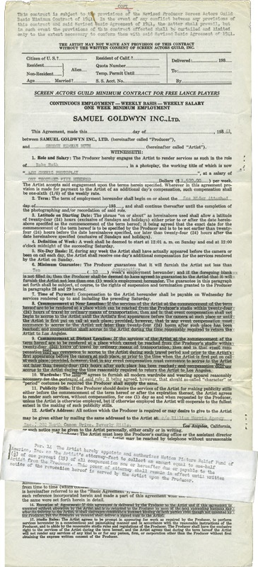 8.5 x 19'' double sided contract between Babe Ruth and Samuel Goldwyn Ltd for Ruth to appear in the film "Pride of the Yankees" about the life of Lou Gehrig. At the time that the contract was signed, the name of the movie was yet to be determined and is identified as "Lou Gehrig Photoplay." Ruth would be required to work "not less than 10 consecutive weeks" and would be paid a salary of $1,500. The contract is unsigned. Usual fold lines and some minor edge wear. Excellent condition.