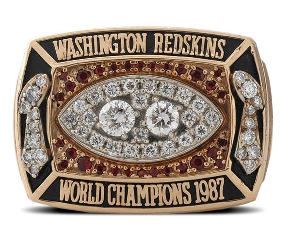 Tight end Anthony Jones was a substitute in the Washington Redskins Super Bowl XXII win. Diamond-studded crown, with “Jones” and “58” on right side, and “Hail to the Redskins” with score “42-10” on left. “10K” and “Tiffany & Co. 1988” on inside. Size 11.5