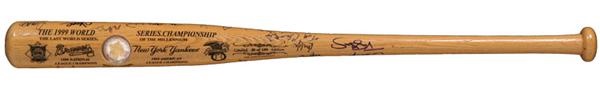 A millennial celebration, this busy lumber has burnt on its barrel “The 1999 World Series Championship, The Last World Series of the Millennium.” The Yanks would not only win this last (against the Braves), but would win the first (and their last since) of the new millennium in 2000. World Series coin is secured in plastic in barrel, and populated all over bat are 20+ signatures, grades ranging 5-9/10, and including Mariano Rivera “W.S. MVP.” Bat is Limited Edition 40/199. LOA.