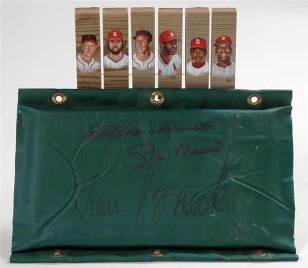 Artist Lisa Ober grew up in Missouri and now lives in the St. Louis area, so her hand-painted portraits of these seven Redbirds carry a certain amount of fan flavor. All six of the living St. Louis Cardinals are represented here - Ozzie Smith, Bob Gibson, Stan Musial, Red Schoenienst, Bruce Sutter, Lou Brock and Bob Gibson are painted in color by Ober on small pieces of the old Busch Stadium dugout bench. In addition, a piece of the old Stadium's dugout rail padding is here with signatures from Musial, Brock and Schoendienst. All are NRMT.