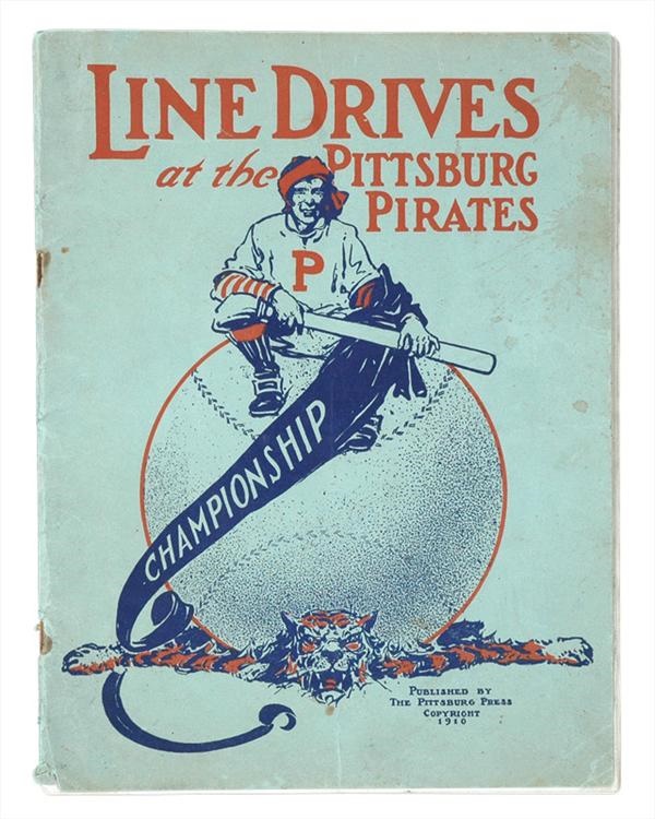 Exceptionally rare thirty-two page publication recounts the Championship season of 1909, when Wagner defeated Cobb in one of the most exciting Series ever. All the stars, including Honus himself, are pictured inside, with amazing full-page images of Forbes Field from a quarter-mile away, with Model T’s and horse-drawn wagons in the foreground. There are great cartoony caricatures of the players with a brief poem for each. Overall VG with some spine wear and some of the center pages loose from the staples, but present.