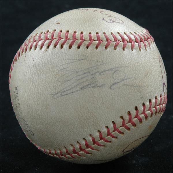 One of the last ones - Clemente signed this Official League baseball for the celebration of his 3000th hit (Sept. 30, 1972) for the Education Department. He died on December 23, 1972. It has a game-used appearance with some light toning, and carries Clemente’s lovely blue ballpoint signature (6/10) on a side panel, along with the signatures of Eugenio Enguerra, boxer Sixto Escobar, Terry Garica, and Pepe Seda.