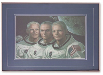 Classic image of these heroes of space is signed by all three on this famed painting by Alton S. Tobey. Neil Armstrong, Michael Collins and Buzz Aldrin have signed this 15x10" print in Mint black felt tipped pen. Framed and matted, print has some caressing which does not affect the signatures and mounting makes it look overall excellent.