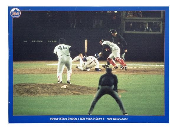 Expansive photograph captures all three principle players in one of the many thrilling moments in game six of the 1986 World Series - Met Mookie Wilson hits the ground after ducking the wild pitch thrown by Bob Stanley, and Red Sox catcher Rich Gedman makes a game try at retrieving the baseball. Kevin Mitchell would score from third, and Boston would lose control of the game. A photograph as big as the moment. Printed onto mansonite board, it measures 64x47”.
