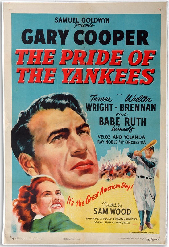Linen-backed lithograph of classic RKO film “The Pride of the Yankees” with great visuals of Gary Cooper, Teresa Wright, and a bat-swinging Babe Ruth as “himself.” Measures 27 ? x 41”, with slight restoration.