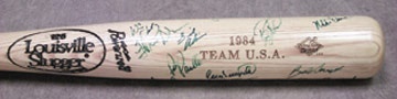 Specially produced Louisville Slugger is engraved with the words, "1984 Team U.S.A." and signed in perfect blue sharpie by the full roster. Of course, the man you're wondering about is there, "Big Mac" McGwire himself. NRMT.