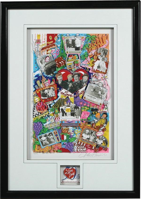 Pop artist Charles Fazzino is no stranger to the world of sports, having commemorated nine Super Bowls and been the official artist for baseball’s All-Star Game, the Indianapolis 500, and the U.S. Olympic Team. Here he celebrates the 50th Anniversary of iconic television series “I Love Lucy,” using his famed 3D style with layered cutouts depicting several classic moments from the ‘50s comedy sitcom. The back of the frame is also decorated by the artist with a looser, painterly image of Lucy and Ricky on a Zenith television set and printed above in bold blue, “Lucys I’m Home!” Immaculately framed, this limited edition (179/200) measures 24x35”, and is signed by Fazzino in pencil on front and lavender paint on back.
