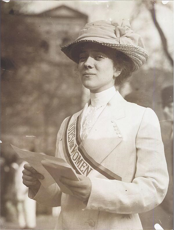 Proud-faced suffragette shown in 8x10 black and white photo. Woman is wearing a "VOTES for WOMEN" sash. Small rips on left and right sides of photo. This a true vintage 1910s print, regardless of the date stamped on the back.