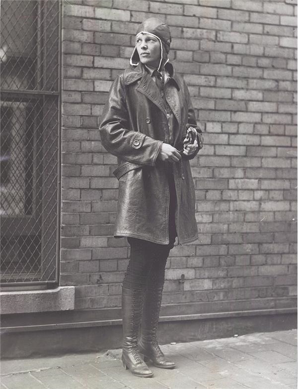 This exceptional image from Wide World Photos show "Lady Lindy" Amelia Earhart donned in her flying togs. Caption affixed to the back dates the photo 6/5/28, two weeks before Earhart became the first woman to fly across the Atlantic Ocean. Photo measures 7 1/2 x 9 1/2" and is EX.