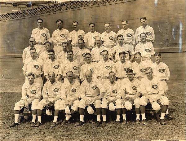 This team photo of the 1930 Cincinnati Reds measures 7 1/2 x 5 3/4" and is affixed to a Cincinnati Post photo dated April 14, 1930, showing the team posed in the same configuration and identifying each of the players in the caption (while duly noting that Leo Durocher missed the team picture). VG.