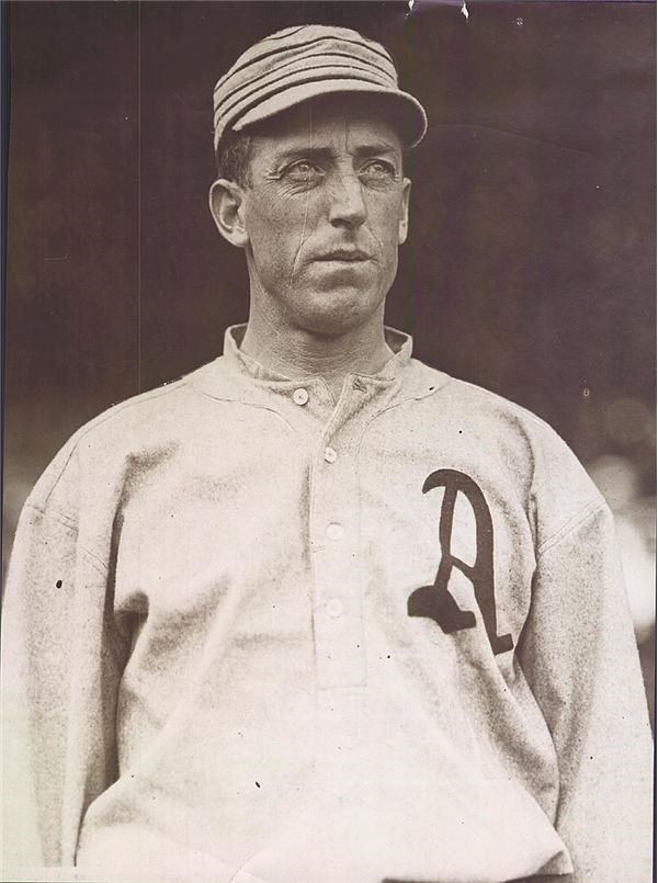 Hall of Fame Philadelphia Athletics pitcher Eddie Plank is depicted in this classic photographic portrait from the 1910s. Photo is 100% vintage with vintage wire photo printing on the back. Measures 6 x 8" and condition is VG-EX.